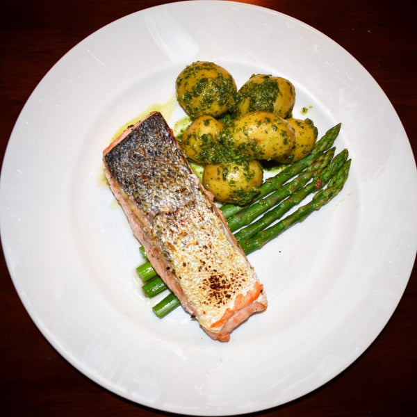 Grilled Salmon, Salsa Verde Potatoes, Asparagus